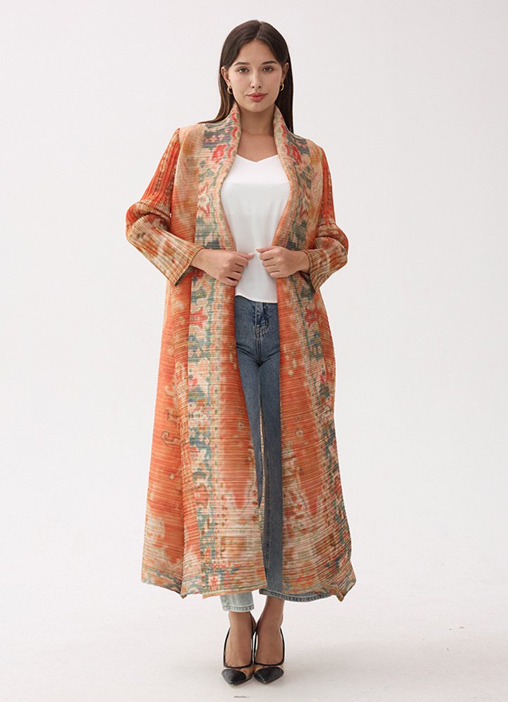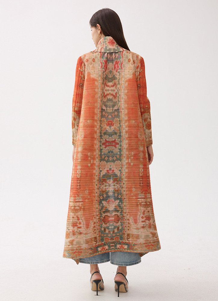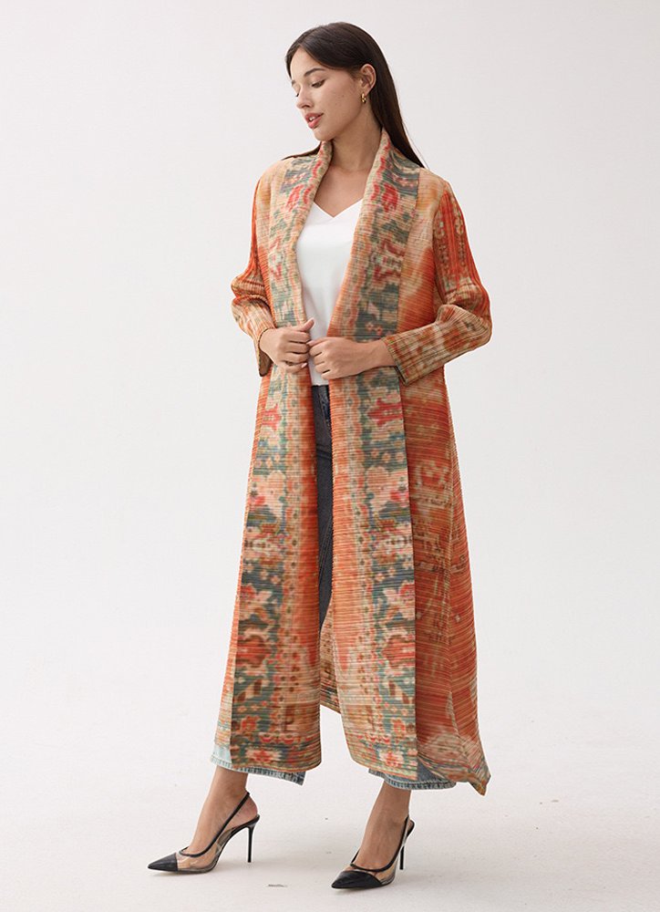 A longline coat featuring ethnic – inspired patterns and signature pleating. It merges cultural aesthetics with modern design, offering a unique and stylish outerwear option for B2B fashion collections.